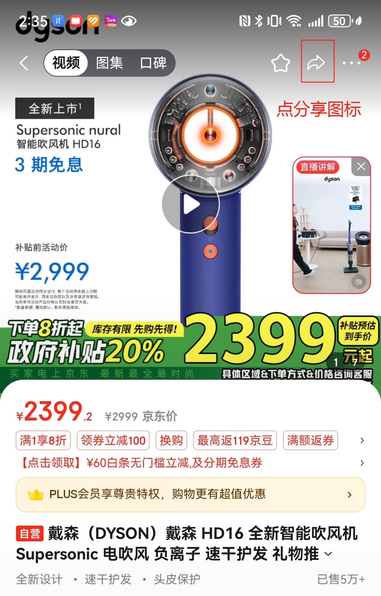 (一)打开京东,搜索商品,例如搜索“戴森吹风机”进入商品列表,点击想要的商品。